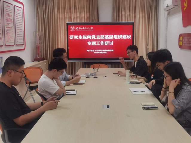 随后2019级博士研究生沈锋、2020级硕士生曹冯婷分别就支部基本情况、德育建设、理论建设、文化建设、科研工作等几方面进行详细交流分享,并重点交流了各自支部的优势特色工作,如微波光子学研究生党支部的“党团联动工作机制”,及天地一体频谱认知智能实验室研究生党支部的“党员公益服务监督机制”,都取得在场师生的一致赞同,并表示应逐步推广至全体纵向党支部的日常建设中,通过各类工作流程落实打好支部建设基础,同时发挥研究生纵向党支部的导师资源及科研赋能优势,打造理论基础好、执行力强、创新水平高的研究生纵向党支部。